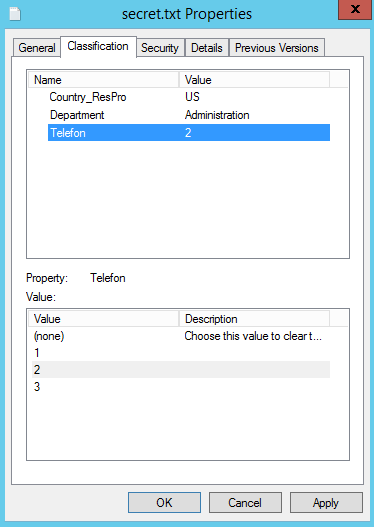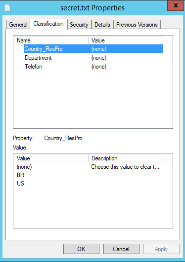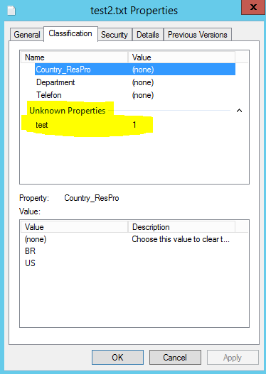 Wird ein File auf einem Server 2008R2 Klassifiziert, wird wie bei Server 2012 ein alternate Stream generiert. Dieser Stream wird beim Kopieren nach 2012 (NTFS to NTFS) wie oben beschrieben mitgenommen. Das Property wird dann als „Unknown“ gelistet, wenn es nicht definiert wurde. Ab Server 2012 ist ein zentraler AD Abgleich von Classification Properties implemtiert worden. Server 2008R2 unterstützt diesen Abgleich noch nicht!