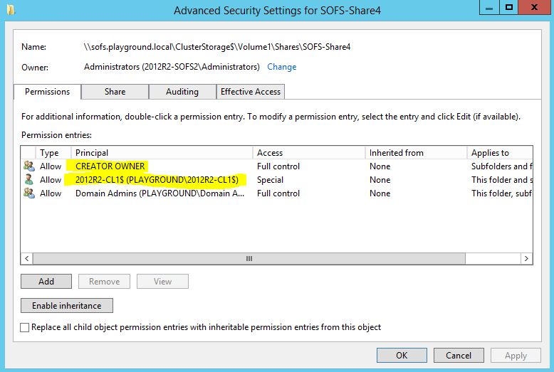 Sobald ich mit einem Mitglied der Domänen-Administratoren über die Hyper-V bzw. Failover-Cluster Konsole etwas auf den Share ablege oder ändere, trägt sich wie unten im Screenshot automatisch der Computeraccount und der CREATOR OWNER ein.