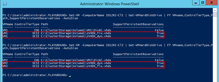 Get-VM -ComputerName 2012R2-Cl1 | Get-VMHardDiskDrive | FT VMname,ControllerType,Path,SupportPersistentReservations -AutoSize